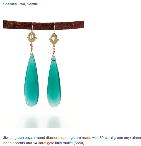Jiwa's green onyx almond diamond earrings are made with 30-carat green onyx almonds, diamonds, 18-karat gold bead accents and 14-karat gold tulip motifs ($650).