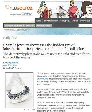 "'The first time I saw labradorite, I thought it was an ugly, sludgy gray -- but it had fire,' says local jewelry designer Shamila Jiwa. My sentiments exactly. But when I met Jiwa, she was wearing a stunning necklace with such fluorescence that I was converted."